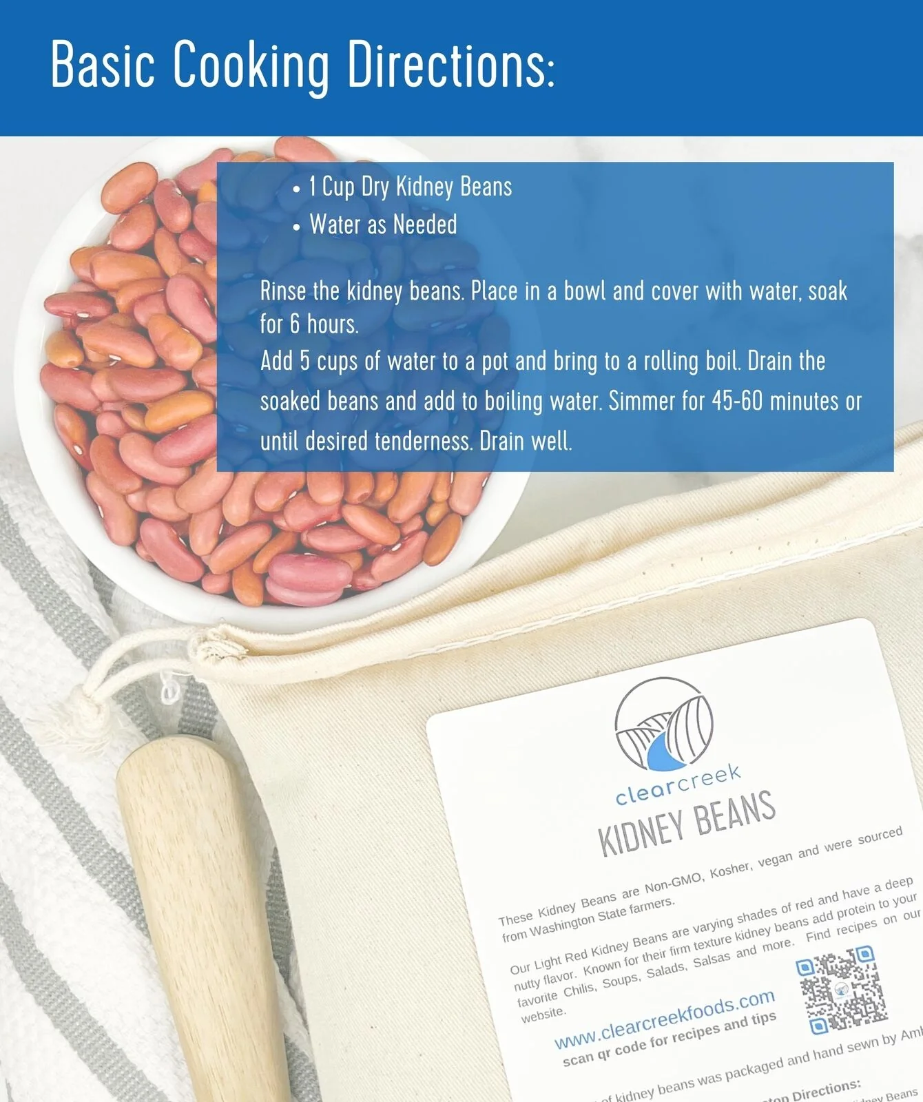 Clear Creek Kidney Beans are sourced Washington State farm. Locally grown, Pacific Northwest products like our kidney beans are the perfect pantry staple. Our 4 pound kidney beans are packaged in our reusable, drawstring linen bags. They are made from 100% plant-based cotton and printed with water based ink, making them sustainable, environmentally friendly and easy for pantry or cupboard storage.