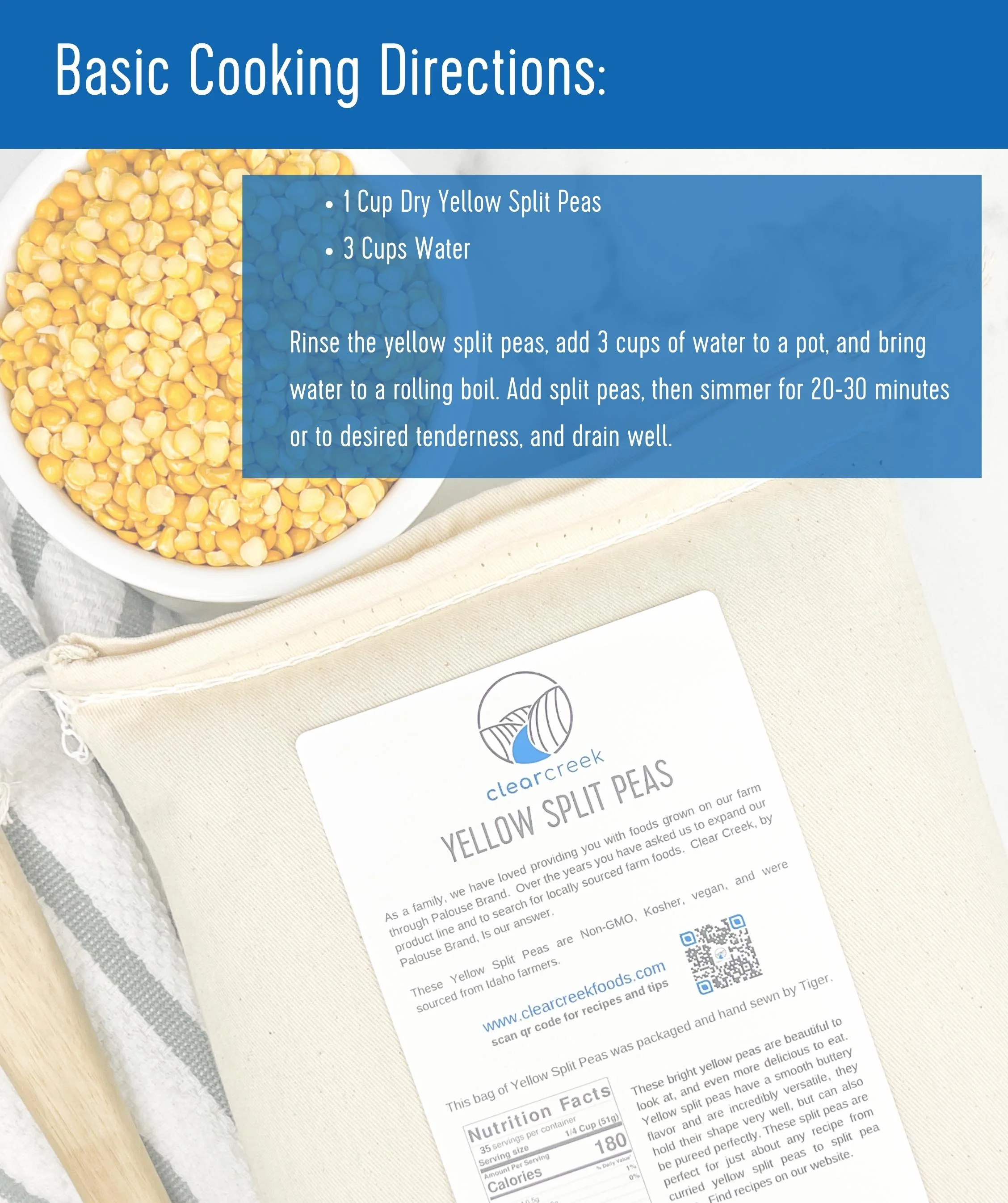Clear Creek Yellow Split Peas packaged in our 25 pound bag gives our customers the greatest value per ounce. These split peas are sourced from an Idaho farm giving our customers a taste of the Pacific Northwest flavors and quality.